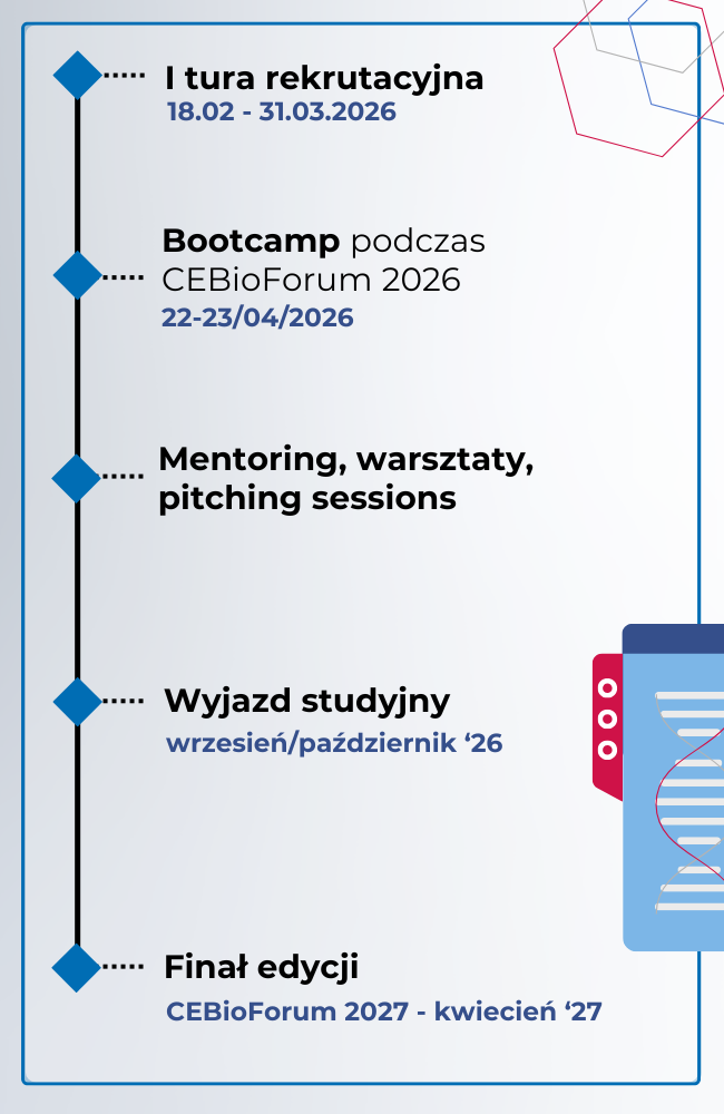 Program trwa 9 miesięcy i obejmuje intensywne bootcampy w Warszawie, wizytę studyjną w Niemczech – jednym z najbardziej zaawansowanych ekosystemów innowacji w Europie – oraz dostęp do międzynarodowych mentorów, inwestorów i liderów branży. Uczestnicy mają również okazję zaprezentować swoje projekty przed kluczowymi graczami rynku podczas CEBioForum, jednej z największych konferencji biotechnologicznych w regionie.